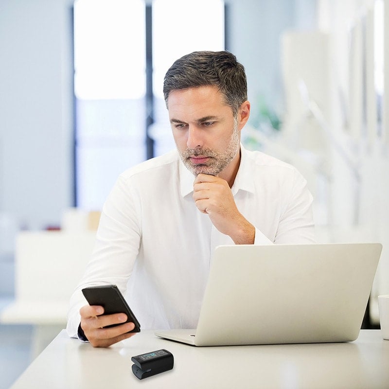 The battery-operated Bluetooth pulse oximeter PC-60FW from viatom measures blood oxygen level, pulse rate, perfusion index and pulse intensity in less than 8 seconds. The collected data can be transmitted to a smartphone via Bluetooth and recorded and stored there in the matching Vihealth app.