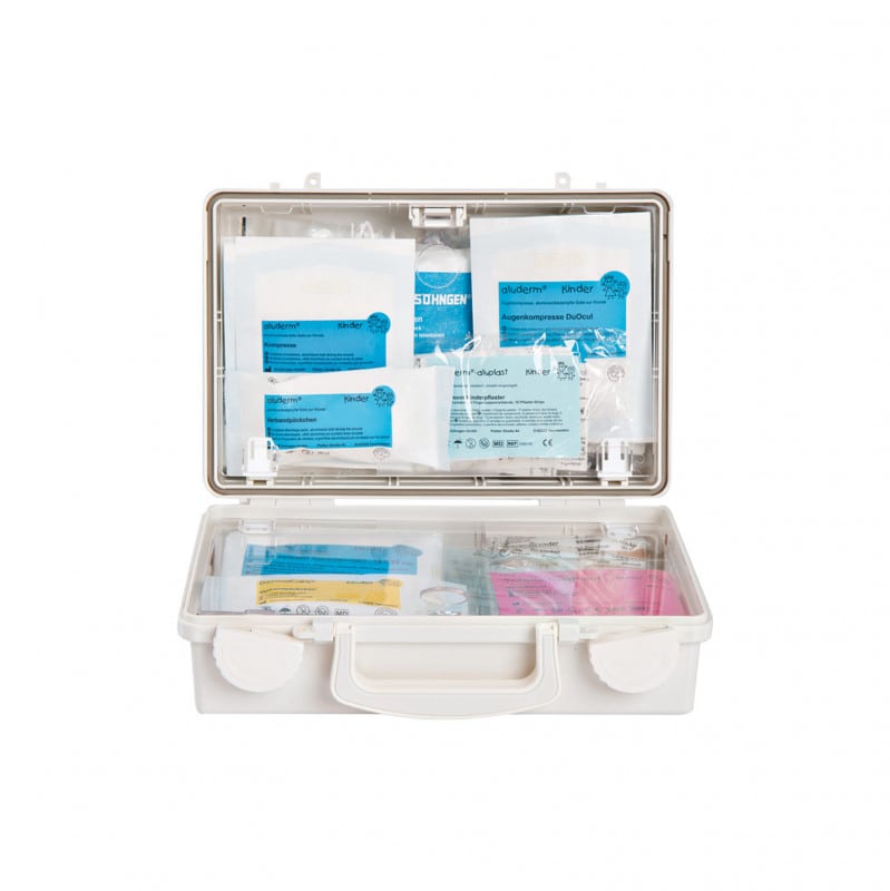 The " Little BIG Help" Kindergarten QUICK-CD is a first aid kit from Söhngen that has been specially designed for kindergartens and day care centres. Since various injuries occur repeatedly in kindergartens and day-care centres during playing and romping, it is essential to have bandages on hand. The dressing material in the first aid kit is specially adapted to the needs and smaller body size of children and enables optimal wearing comfort and fit as well as ideal wound healing.