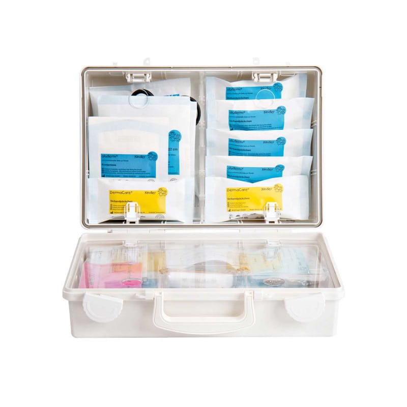 The "Little BIG Help" School first aid kit from Söhngen is equipped with dressing material for treating the most common injuries in everyday school life. The dressing material is adapted to the size of the pupils and is suitable for quick wound care of cuts or abrasions. Thanks to the clear layout and the transparent covers, the dressing material required can be found quickly. In addition, the transparent cover flaps prevent the dressing material from falling out when opened.