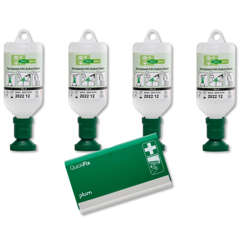 Set 1 | 4 x eye wash, sterile 0.9 % NaCl solution (500 ml each) in case of contact with foreign bodies and certain chemicals (solvents, oil) 1x QuickFix plaster dispenser (empty) |