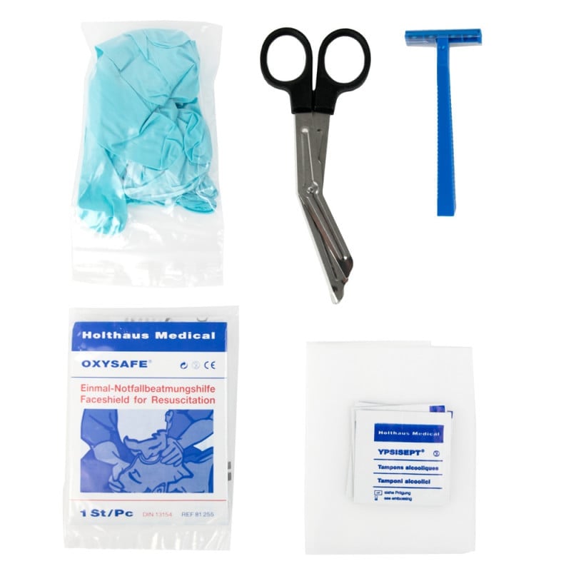 - Emergency kit consisting of 2 pairs of disposable gloves, 1 faceshield for resuscitation, 1 dry towel, 1 disposable razor, 1 disinfectant wipe & 1 pair of scissors.