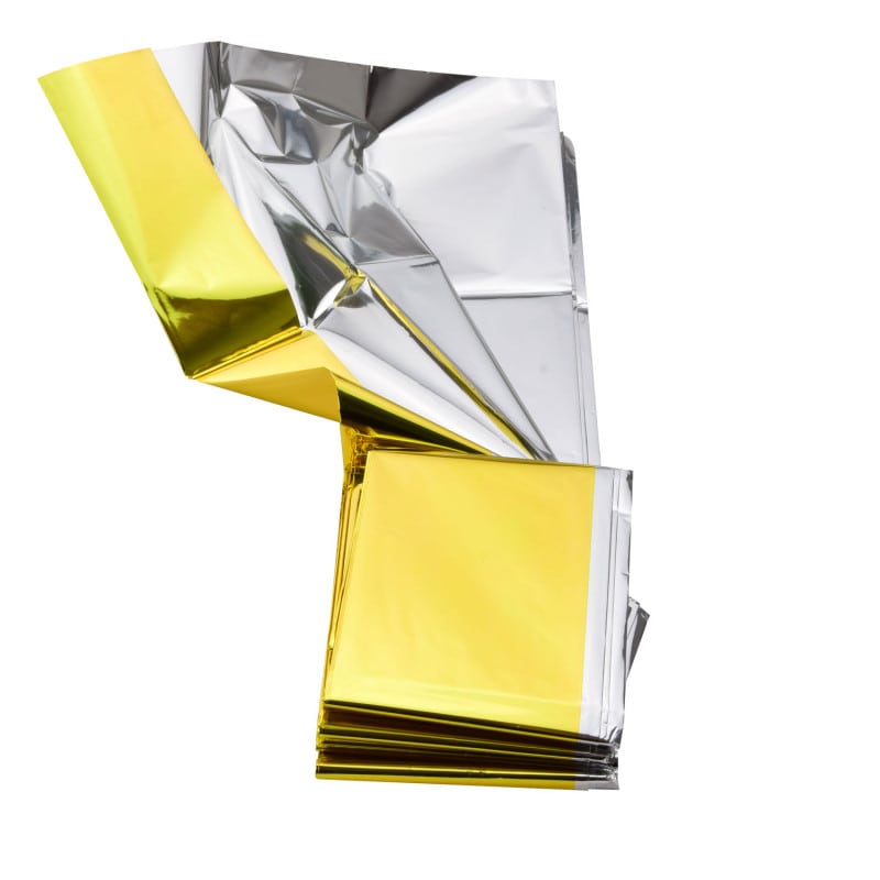 The Teqler rescue blanket is a lightweight temperature-tolerant foil designed to protect the user from hypothermia during emergency situations. The fact that this rescue blanket has a gold and silver side means it can be used for cold protection as well as heat protection. The user is protected from cold when the gold side is facing outward and protected from heat when the silver side is facing outward.